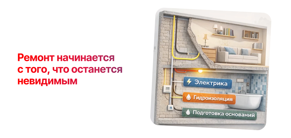 Профессиональные строители знают: "Ремонт начинается с того, что останется невидимым". Именно скрытые работы определяют качество финишной отделки, будет ли в доме безопасно и комфортно. В сегодняшней статье разберем три кита, на которых основывается любой качественный ремонт: гидроизоляцию, разводку электрики и подготовку оснований. Эти те самые этапы, которые постоянно пытаются удешевить, только цена такой экономии — будущие различные проблемы, стоимость устранения которых превысит все "сэкономленные" средства.