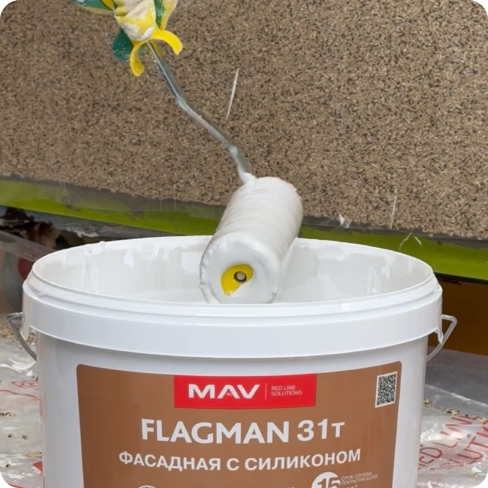 Отдельно используется фасадная краска. Чаще всего применяются силиконовые фасадные краски, потому что они позволяют фасаду «дышать» и значительно увеличивают срок службы декоративного слоя.