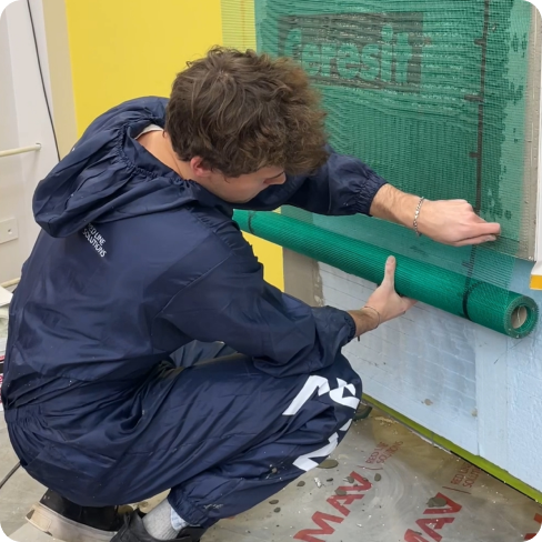 5. Армирующий слой. На утеплитель наносится базовый клеевой раствор, в который утапливается стеклосетка. Этот слой распределяет нагрузки и защищает фасад от трещин.