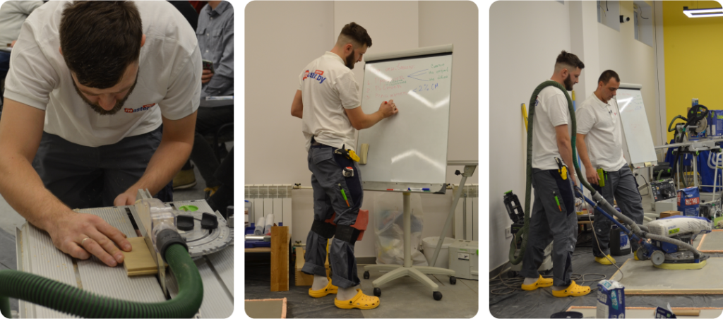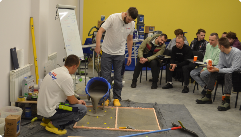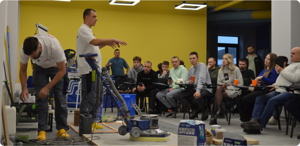 Каждый этап мастер-класса проходил с постоянной обратной связью: специалисты показывали, как нужно работать со всеми материалами, объясняли, что стоит учитывать при его укладке, и какие ошибки могут привести к дефектам в напольных покрытиях.