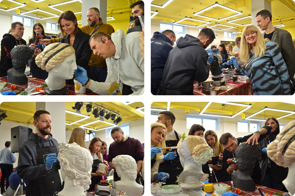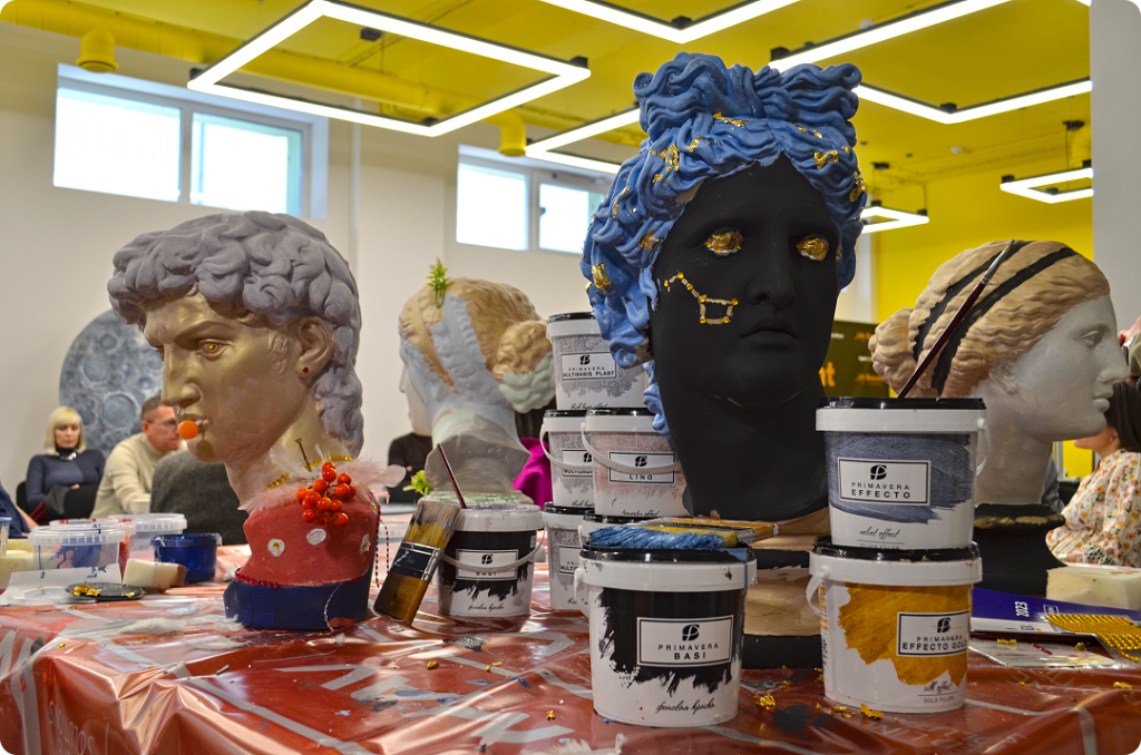 Вторая группа занималась декорированием гипсовых бюстов. Это мастер-класс о техниках работы с различными покрытиями и о воплощении художественного видения. Участники экспериментировали с текстурами и цветами, создавая из обычных гипсовых форм произведения искусства. Такой опыт стал для многих возможностью раскрыть творческий потенциал и увидеть, как можно интегрировать элементы декора в проекты, работая с нестандартными материалами.