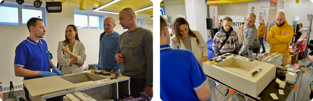 Далее программа перешла в практическую часть, где участники разделились на два мастер-класса. Первая группа погрузилась в создание раковины из керамогранита. Это был настоящий урок по работе с этим материалом: от его резки и шлифовки до полировки и сборки готового изделия. Дизайнеры увидели, как сложно создать такой предмет, как керамогранитная раковина, и вместе со строителями разрабатывали идеи, как интегрировать её в интерьер.